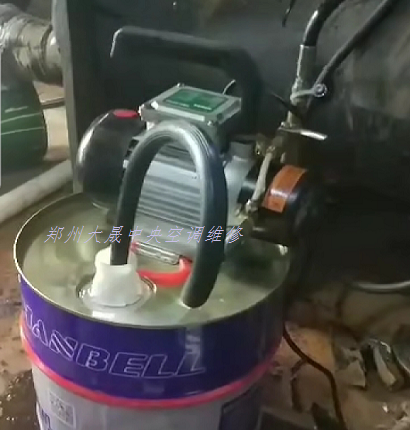 花開。又進(jìn)入中央空調(diào)的維保季節(jié)中。鄭州格力螺桿機維保中,更換專用油一